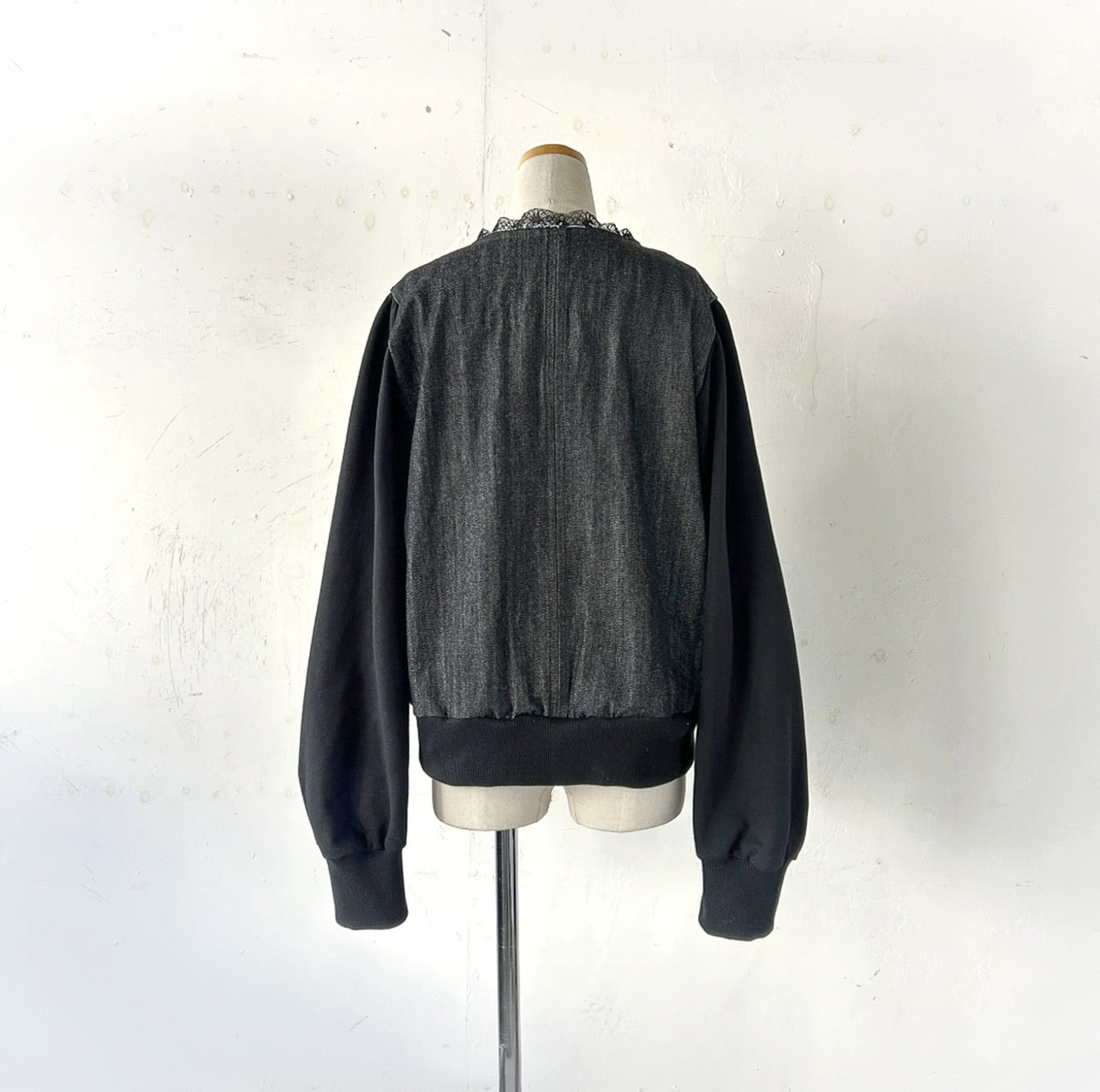 袖は伸縮性があり着やすいスウェット素材、後ろはブラックデニム