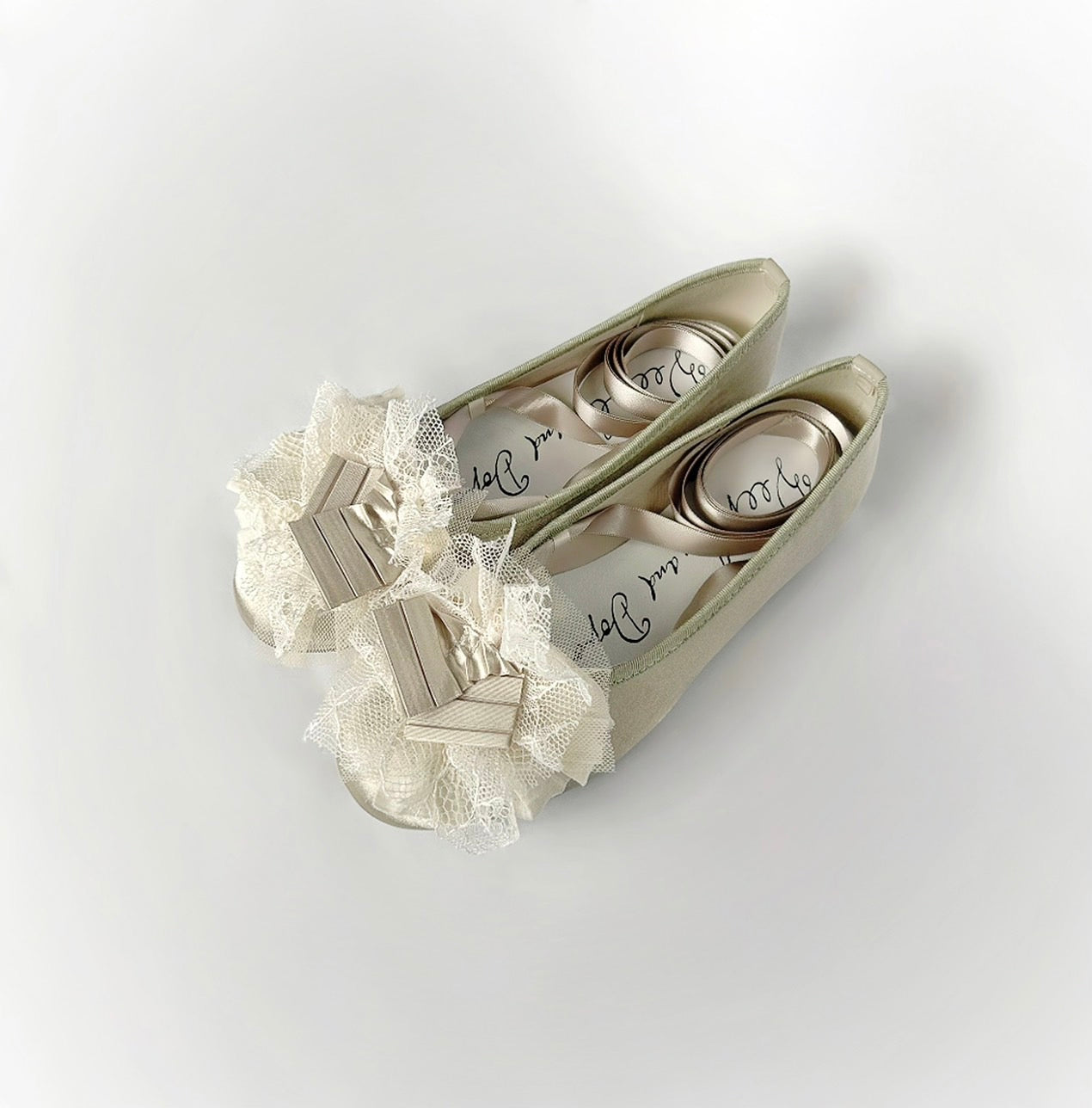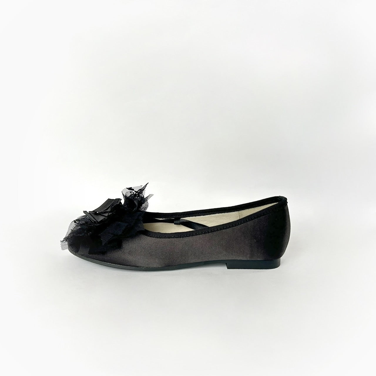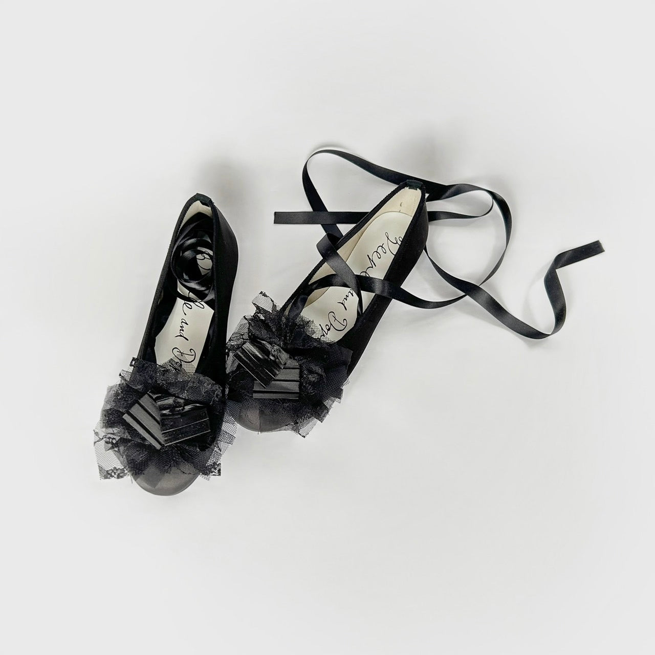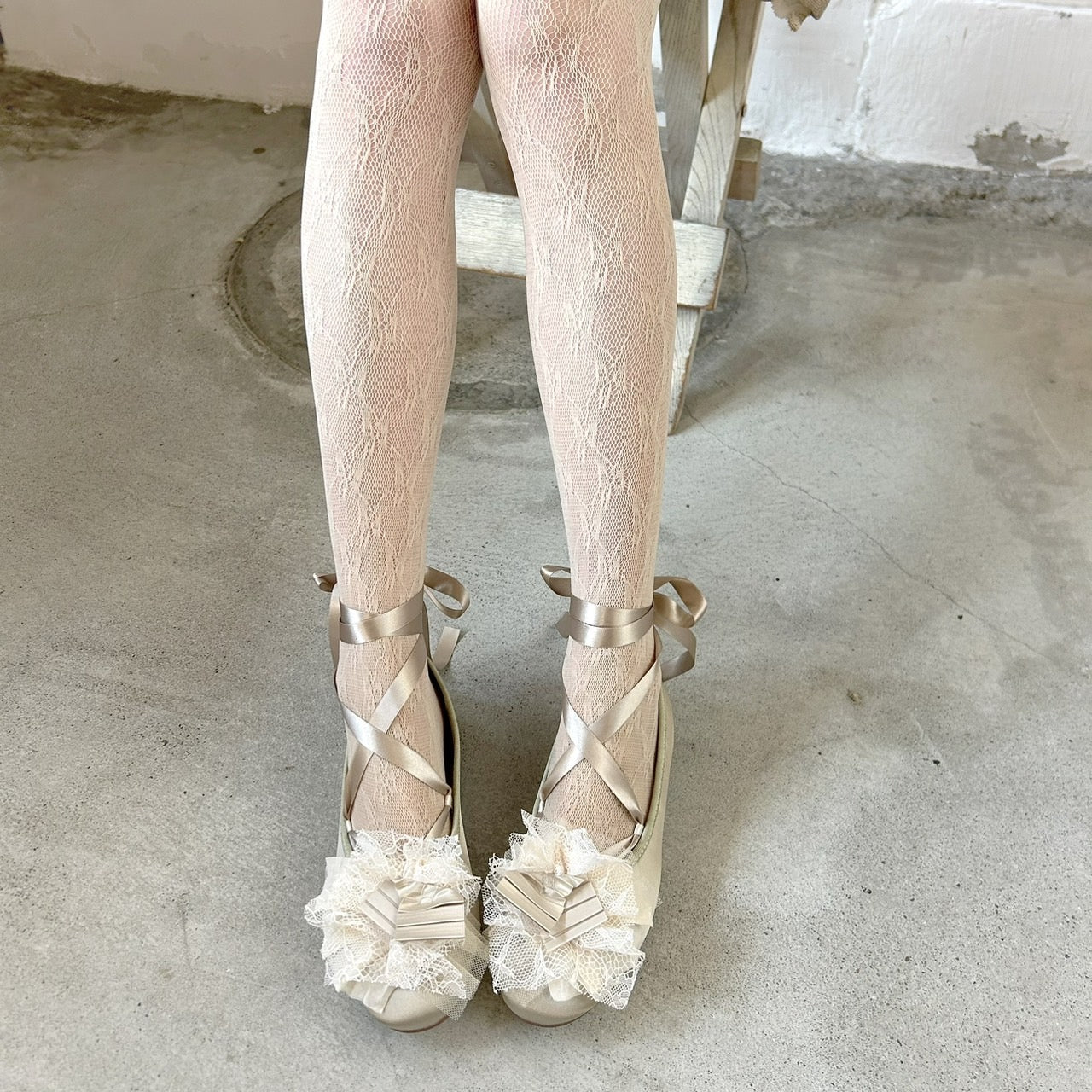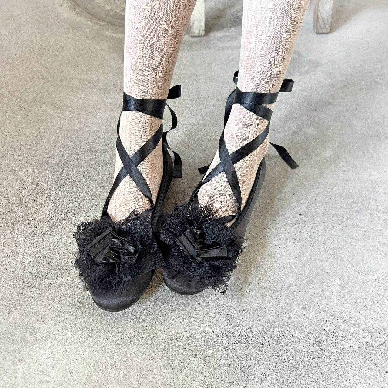 ツヤを抑えたサテン生地のVeerleオリジナルバレエシューズに、プリーツテープとMIXレースをトッピング