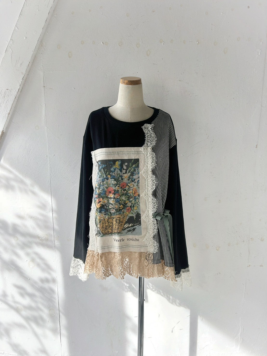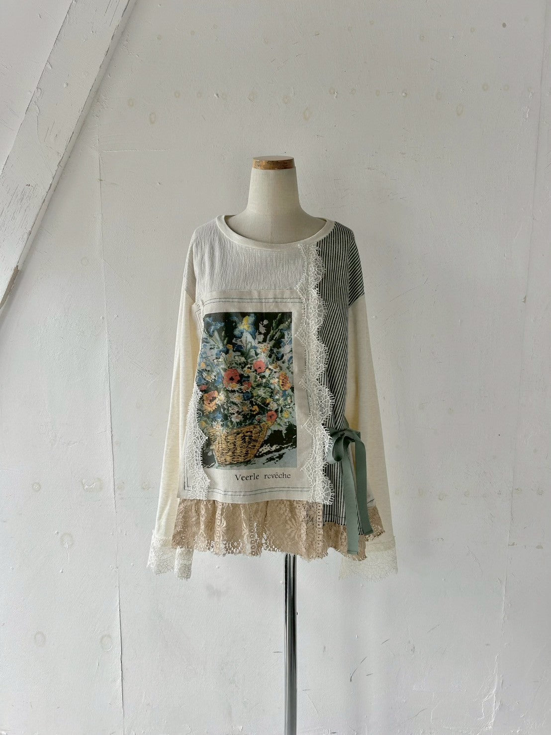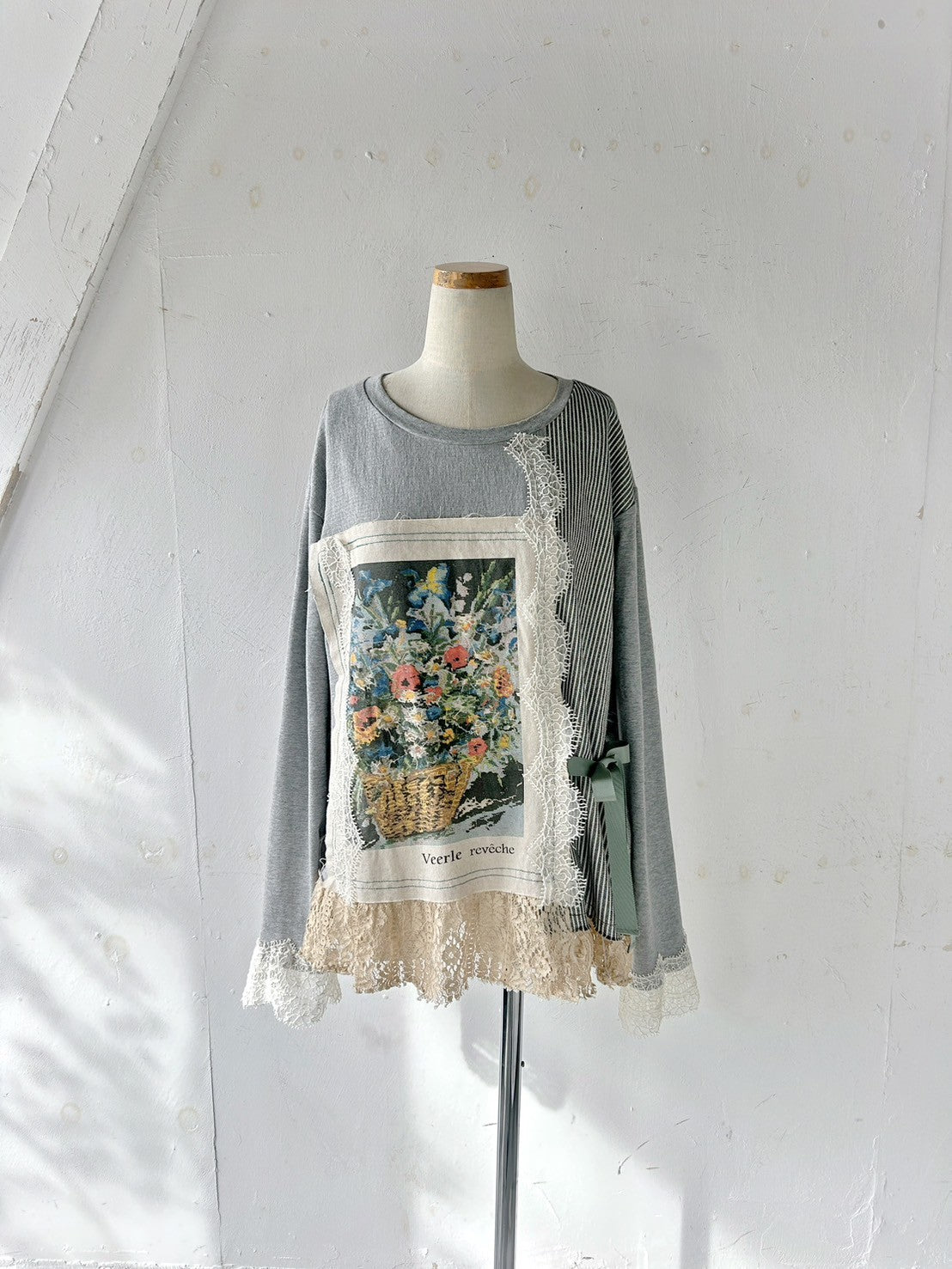 目を惹くフラワー刺繍プリントのリネンキャンバスをメインに、カジュアルなヒッコリーと、表情豊かなピケストライプ天竺を組み合わせた、アシンメトリーデザインのプルオーバーが登場。