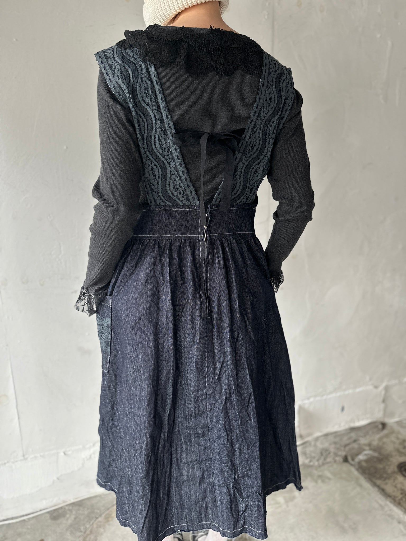 両サイドには便利なアウトポケット、背中にはアクセントになるリボン、裾には繊細なレースをあしらい、大人可愛いデザインに仕上げました。後中心のファスナーで着脱もスムーズ。オールシーズン着回しやすく、ブラウスやニットなど、様々なアイテムとのコーディネートをお楽しみいただけます。