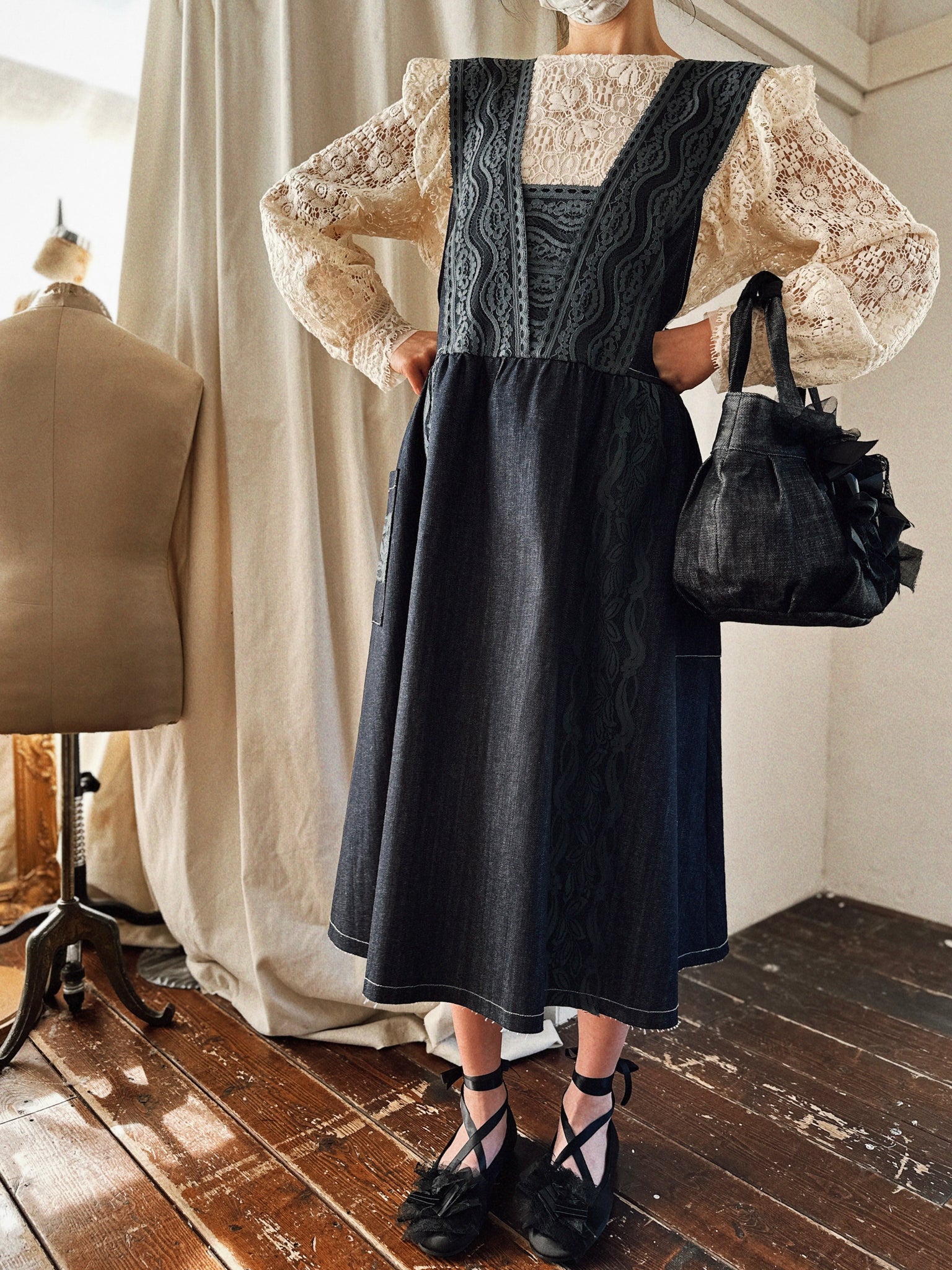 ミルク色のカツラギツイル生地で仕立てた、上品なエプロンドレス。